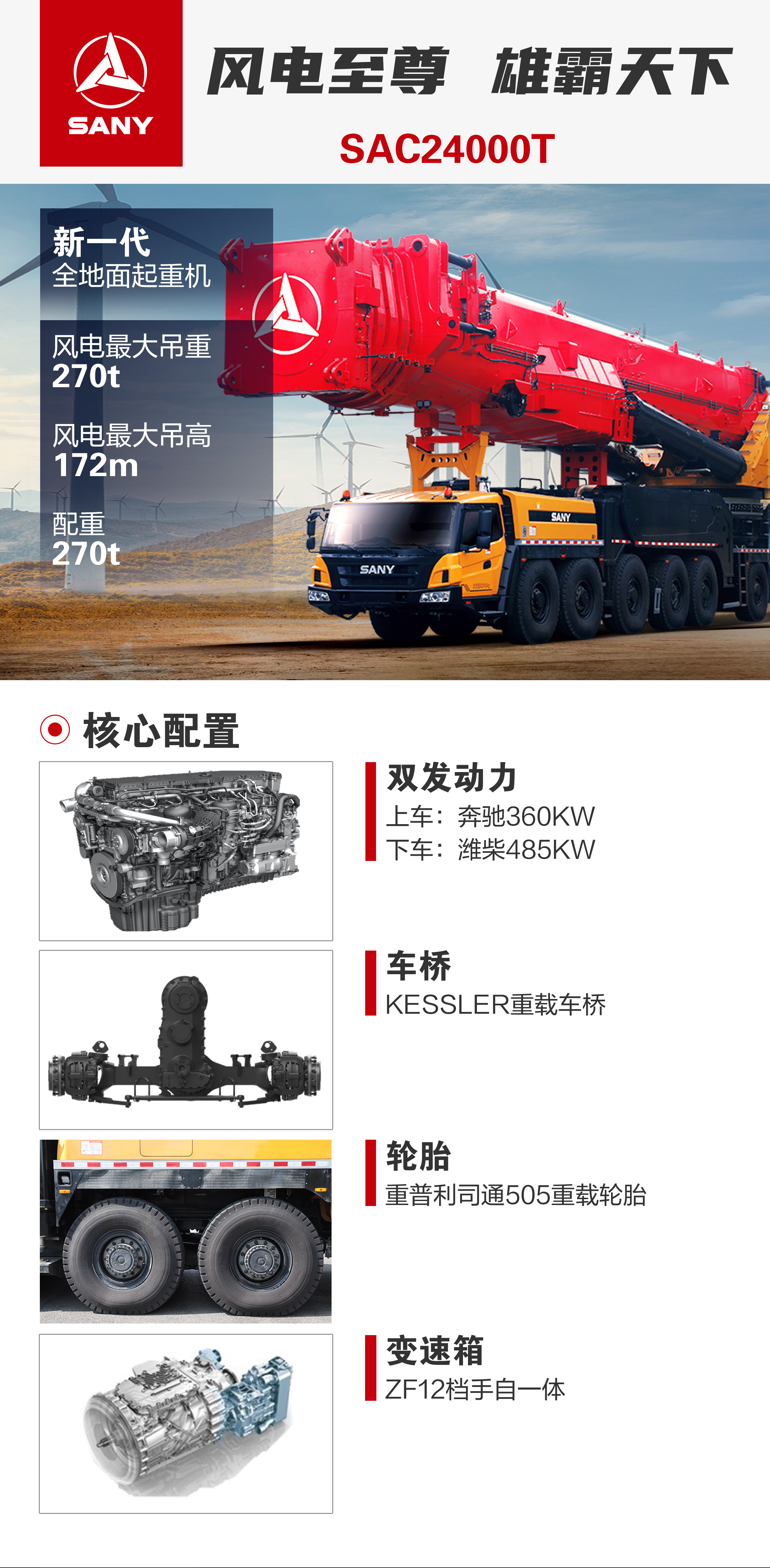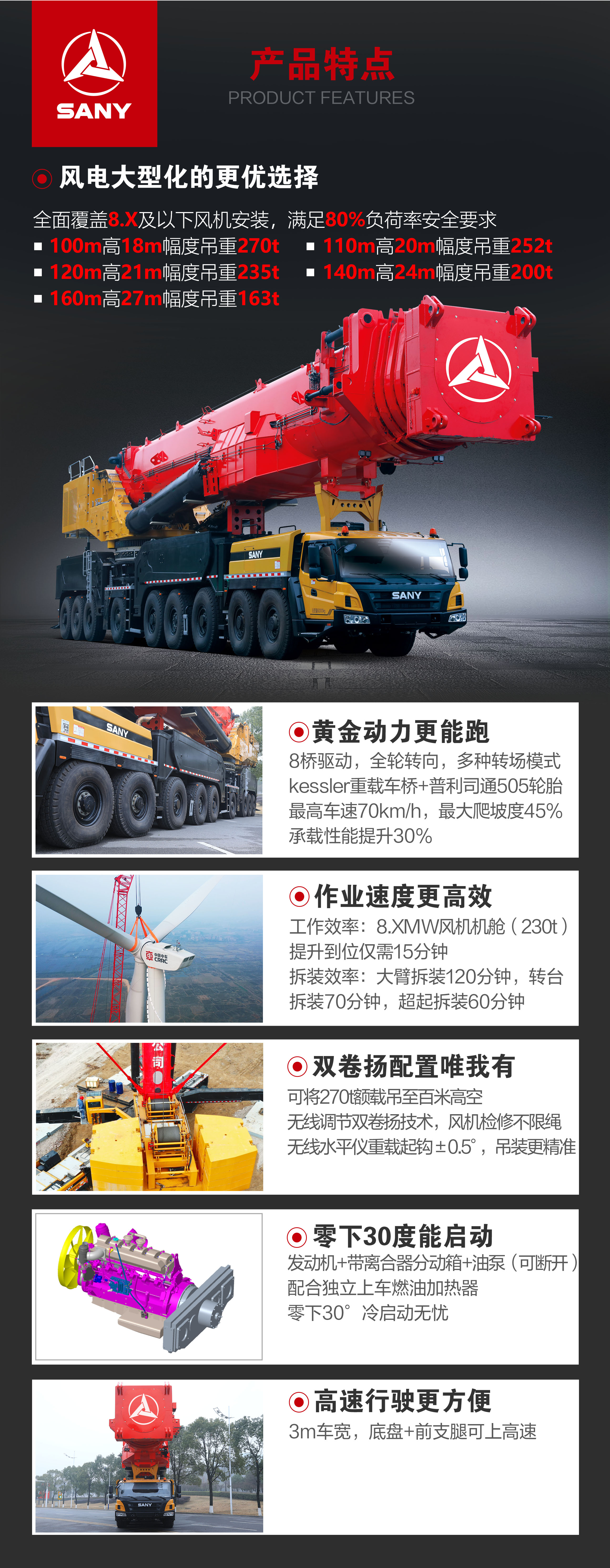 可(kě)将270载吊至百(bai)米高(gao)空;无線(xiàn)调節(jie)双卷扬技(ji)術(shù),风機(jī)檢(jian)修不限(xian)绳;无線(xiàn)水平仪重(zhong)载起钩±0.5°,吊裝(zhuang)更精(jīng)准。