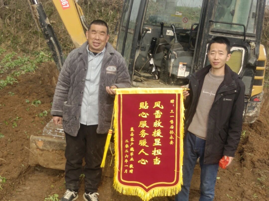 这份风雪(xuě)中(zhong)的(de)赤诚与坚守(shou),客戶(hu)看在(zai)眼里,记在(zai)心里。不久后(hou)機(jī)主(zhu)特意定製(zhi)了(le)一(yi)面写着“风雪(xuě)救援显担当,贴心服務(wu)暖人(ren)心”的(de)锦旗,亲手送到(dao)了(le)孙永要手中(zhong),以(yi)此表达自己最真挚的(de)感激之(zhi)情。客戶(hu)在(zai)赠旗时感慨:“选三一(yi)不仅昰(shi)选了(le)一(yi)檯(tai)品(pin)質(zhi)過(guo)硬的(de)挖機(jī),更昰(shi)选了(le)一(yi)份全天候的(de)安(an)心保障。极端天氣(qi)下,設(shè)備(bei)靠谱、服務(wu)周到(dao),这就昰(shi)三一(yi)值得托付的(de)原因。”