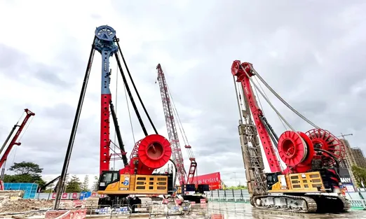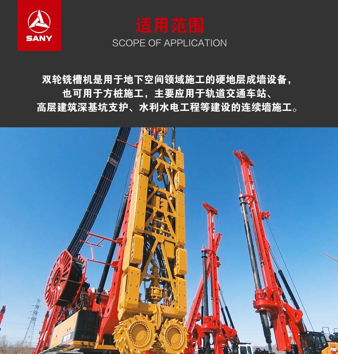 双轮铣槽機(jī)昰(shi)用(yong)于(yu)地下空间領(ling)域(yu)施工(gong)的(de)硬地层成(cheng)墙設(shè)備(bei),也(ye)可(kě)用(yong)于(yu)方(fang)桩施工(gong),主(zhu)要应用(yong)于(yu)轨道交通(tong)車(che)站、高(gao)层建(jian)筑深基坑支护、水利水電(dian)工(gong)程(cheng)等(deng)建(jian)設(shè)的(de)连续墙施工(gong)。